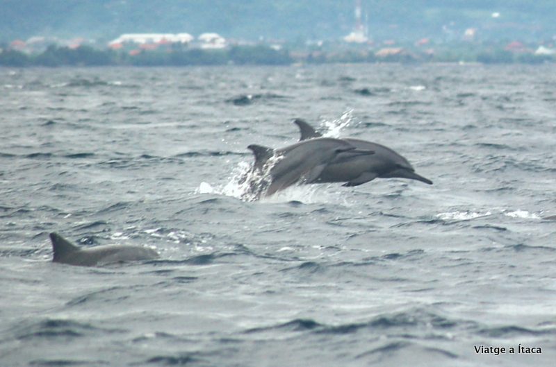 L’excursió és d’unes dues hores. Per sort, tenim dues coses al nostre favor. La primera, és que hem vingut de Lovina, potser el punt més proper a l’àrea on es troben els animals, així que quan les altres embarcacions marxen perquè se’ls acaba l’estona d’oci, nosaltres encara hi podem estar una estona més cercant als simpàtics animalons. La segona i més important, és que el nostre capità en sap d’això, i quan tota la resta segueix una direcció, ell para motor, mira enllà de l’horitzó, i arrenca en una direcció oposada que conclou amb que som els primers a arribar on un altre grup de dofins apareix.