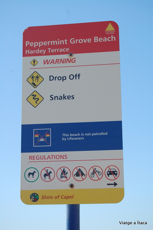 Pel que sembla en aquesta zona també s’hi fan vins i clar, no podem marxar sense provar-ne algun no? Però escollim un parell de cellers que estan en la direcció que hem de seguir. Prop de Capel el primer que visitem és Peperwood, un de molt familiar on tots els vins són de Shiraz, interessant i on la dona ens recomana que anem a la platja Peppermint Grove molt propera allí, així que li fem cas i ens trobem…. El paradís!!!