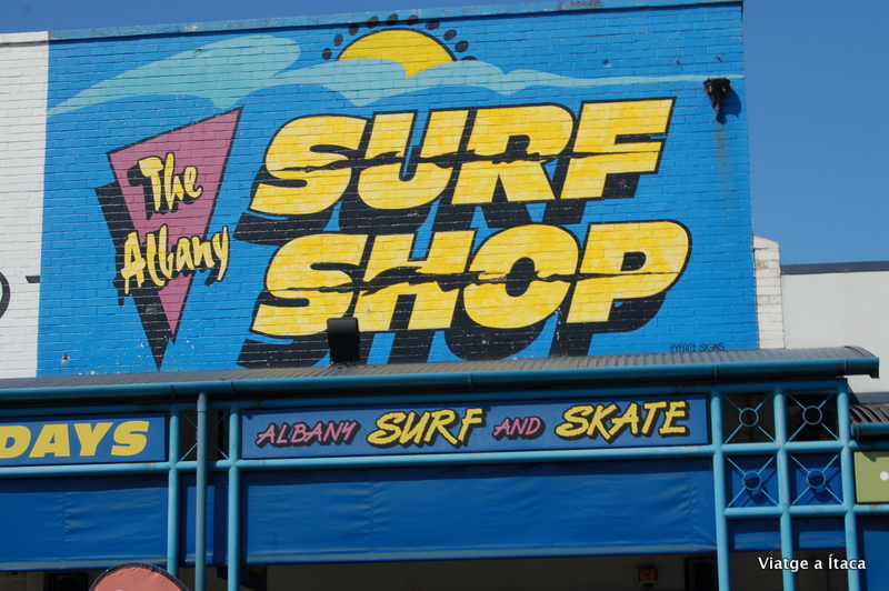 És diumenge, i a més enmig d’un pont, ja que dilluns és festiu. Suposem que per això, la Ocean beach, on anem a continuació, es troba plena fins a la bandera de surfistes, majoritàriament joves, que estan aprenent. Aquí havíem llegit que era un bon lloc per aprendre’n però hi ha massa gent, i quasi fugim corrents…