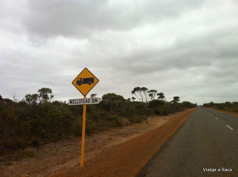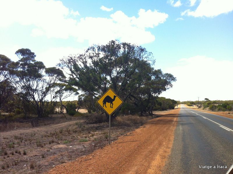 El Western Austràlia, és una zona d’oportunitats. Només un 3% de desocupació, i cartells de “es ven” posats per tota arreu. Anem fent quilometres controlant l’agulla que marca la quantitat de combustible, i veient com va baixant paulatinament. Per entretenir-nos, ens expliquem alguna cosa que no ens haguem explicat, encara que pugui semblar mentida després de quasi 9 mesos de 24 hores junts, o restem en silenci explorant per separat cadascú el seu món interior. Un altre passatemps, és fotografiar les senyals d’advertència o perill que anem trobant, i que donarien per fer una bona exposició fotogràfica. Des del cangur omnipresent, passant per tortugues de diferents tipus, o dromedaris, si, si, dromedaris també en pot haver, si s’han escapat d’una granja que hi ha per la zona que es dedica a criar-los…