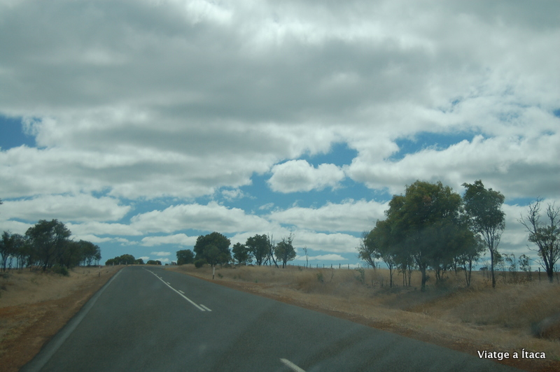 Només sortir del poble, ben aprovisionats d’aigua i benzina com ens havien recomanat, ja comencem a intuir que entrem ens zones menys poblades. Cangurs, o el que queda d’ells després de una trobada amb algun vehicle, donen una benvinguda macabre a la carretera de llargues rectes que anem recorrent. Els senyors de la carretera, camions enormes comencen a aparèixer movent tot el món al seu pas. Aprenem que d’aquestes bèsties d’asfalt n’hi ha de diversos tipus: els de dos remolcs són vehicles llargs, els de tres porten el cartell de trens de carretera, i els de quatre que de moment només coneixem d’oïdes, no sabem quin nom deuen tenir…