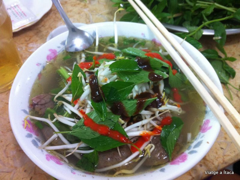 Pues vendría a ser como una sopa donde a parte del caldo, le ponen fideos de arroz (no preguntéis cuales ya que aquí en Vietnam hay miles de ellos), verduras, carne (de ternera o de pollo) y algunas salsas.