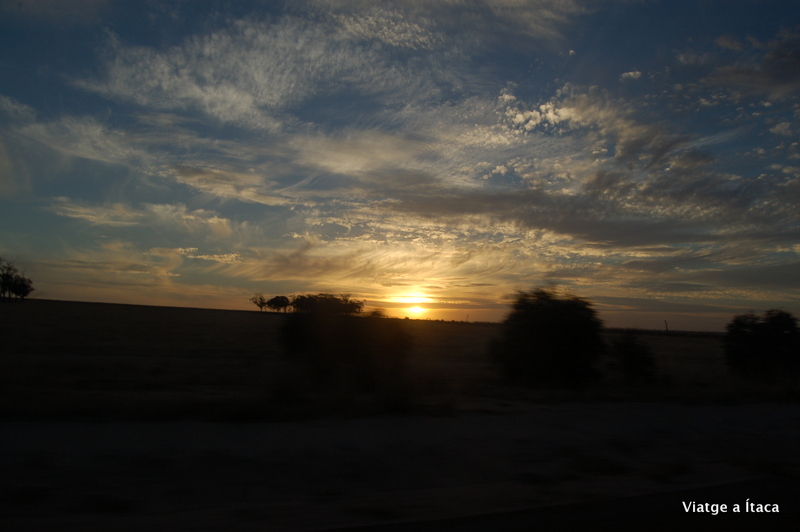 Ara sí, definitivament una carretera llarga, sense aturador, que diria l’Hereu del Polònia. Amb l’infinit com a meta, que anuncia el que serà el nostre recorregut fins demà. Camions i trens de carretera que ens fan de companys puntuals quan passen en sentit contrari, notant la seva presència en cada centímetre quadrat del nostre vehicle. Extenses planúries, amb ovelles i vaques que pasten tranquil·les sobre el terra, que tira més al daurat que al verd.