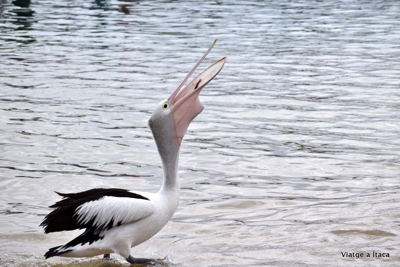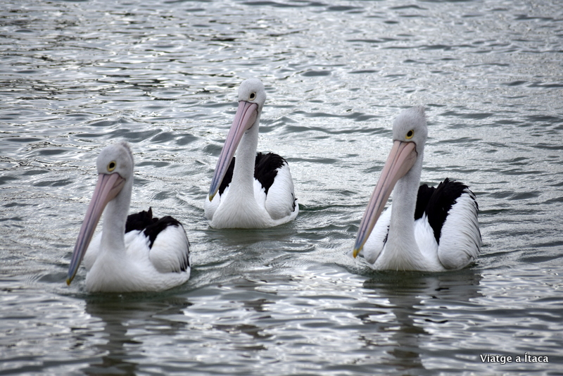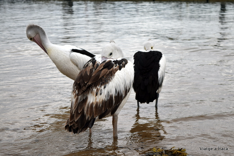 Parada i fonda que s’acosta l’hora de dinar abans de creuar el pont cap a la illa. Nosaltres ja comencem a intuir la gana, però pels que arriba l’hora de dinar és per una colònia de pelicans domiciliada a San Remo, una petita localitat pesquera a tocar de l’entrada a Philip Island. Les dotze és l’hora que la cooperativa del poble els dona de menjar alguns restes de peix que els ha sobrat del seu menú de “fish and chips”, i tot i que nosaltres arribem una hora abans, ja son a la platja tots ben posats esperant.