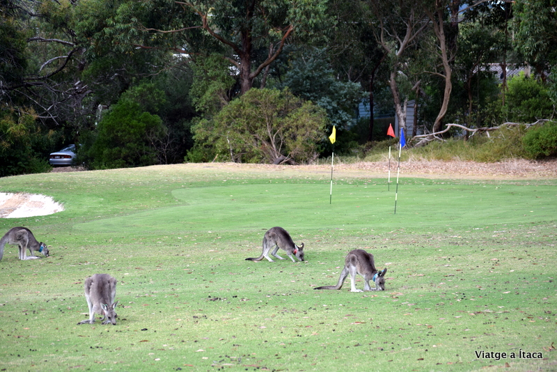Era a Anglesea, on hi ha un camp de golf que te una colònia de cangurs residents que supera el miler. Però només arribar, hi ha uns cartells on t’avisen que no hi entris per fotografiar als cangurs, i tot i que no hi ha gent vigilant i no crec que passes res, doncs ja et treu una mica les ganes la veritat. I tot i que no ens apropem, des de lluny és bastant espectacular veure els cangurs enmig del camp de golf, menjant o estirats a la gespa amb el solet d’última hora de la tarda.