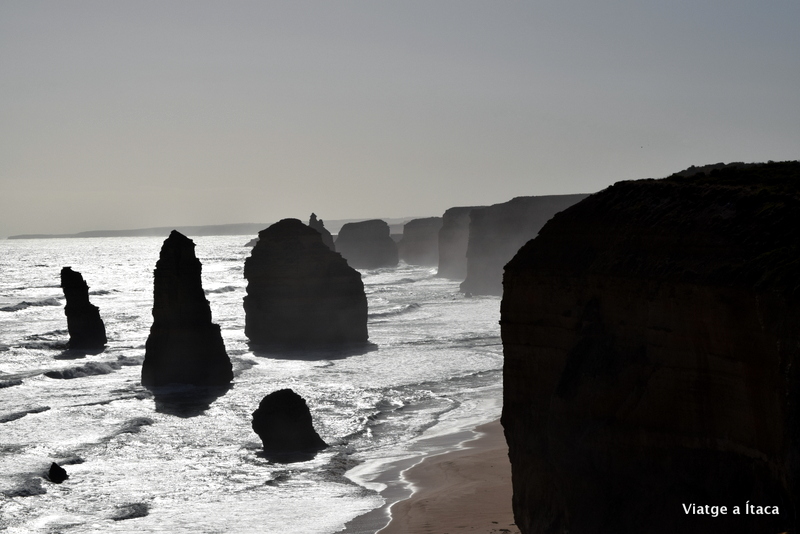 El vent, fort i de cara t’apropa a aquest lloc. Si penses que el món s’ha d’acabar, potser serà aquí, en aquest punt, on es concentra tanta força i et fa sentir tant petit. Difícil d’explicar. Potser el vent s’hagi posat d’acord per fer-te posar en escena, i que contribueixi a que entenguis com s’ha pogut crear tot això. Ell mateix, i la força de les onades han anat modelant aquest paisatge, on 9 pinacles encara queden en peu, i donen nom als 12 apòstols. Resta, si encara no ho has fet…no quadra, però així és…l’explicació, si la trobem, als propers posts.
