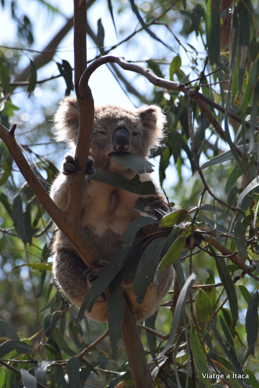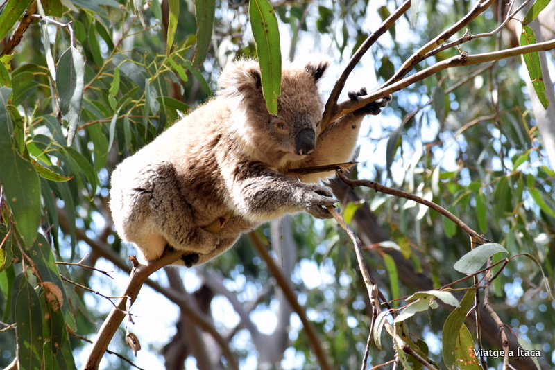 Però sempre, i això en tenim sort, la cirereta del pastís apareix, i encara que estiguis ple, hi ha un petit raconet on fer-la cabre. I és que un crit, i uns ulls desorbitats fan parar a qualsevol. L’Eva sembla que hagi vist un fantasma. Quan pot articular paraula, ho entenc. Diuen que de les 24 hores del dia, els koales en passen 20 dormint, així que per nosaltres la ruleta s’ha aturat just al número al qual havíem apostat, quan en una branca prima que arriba quasi a peu de carretera, un de preciós ens mira. Ho fa mentre menja, i el vent el va movent com si d’un balanci es tractés.