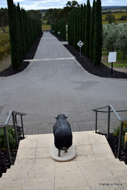 Amb el mapa de cellers sota el braç, i sabent on carregar benzina i menjar, llegim els consells que hem rebut per twitter. I és que una noia ens ha recomanat la visita a alguns cellers de la zona. El primer de nom Wirra Wirra, i et rep una ampolla gegant feta amb suros, tot i que a aquestes terres no en fan servir d’això…
