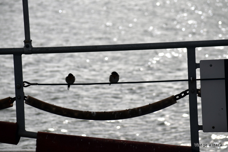 Avui, més que mai ens hem despertat amb el cant dels ocells. No sabem qui ha sigut el culpable, o el beneït que ens ha endolcit el matinar amb la seva dolça veu… ☺ Tasques matineres de rigor, i el motor en marxa. Parem al costat d’una enorme caravana, i quan la plataforma està llesta, entrem a la zona que ens indica la dona que manega el ferry per cable. Barrera baixada i a creuar els trenta metres que separen l’altre braç de terra. Epsss, espera que en falta un per pujar, fem marxa enrere… Nosaltres mentrestant, traient profit d’aquests moments…
