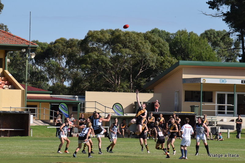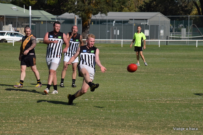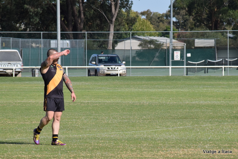 Mentre esmorzem a la furgoneta, escolto crits. No és el meu cap que repica, si no que al costat del càmping hi ha un camp de gespa, i casualment avui dissabte, hi ha partit de futbol australià. Em feia il·lusió presenciar-ne un en directe, perquè ja n’havia vist algun fa temps a la televisió, però és difícil quadrar dates de partits i les nostres estades a les ciutats, així que pel que sembla, avui estic de sort.