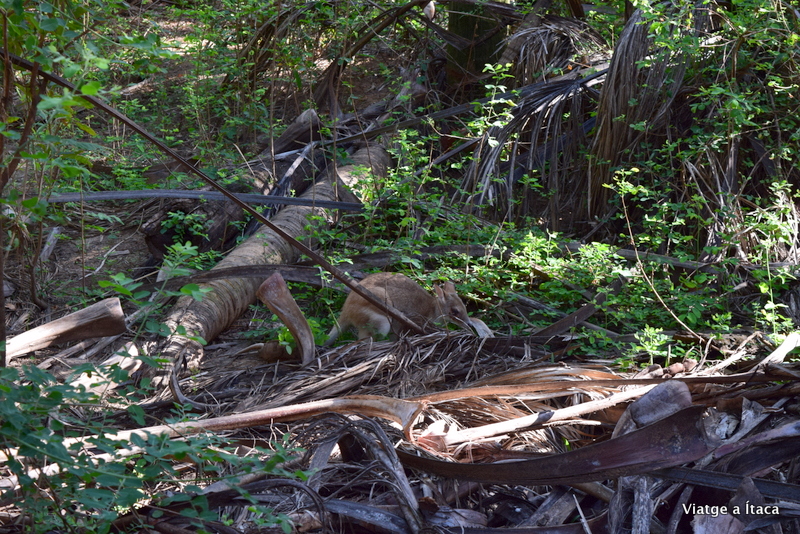Ja en tenim prou, que ens comencem a arrugar, i mentre tornem cap al vehicle, ens creuem amb un altre petit wallabie. No té por, no s’espanta de nosaltres, i passa just al nostre costat, per després endinsar-se a l’espessor de la vegetació i el perdem de vista.