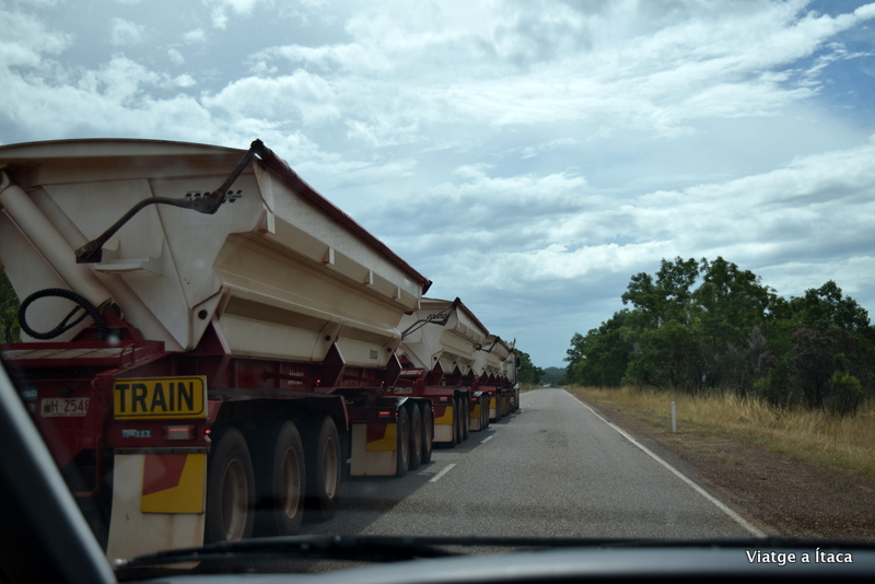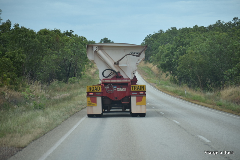 Fem una mica més de carretera, i ja ens anem apropant a Darwin a distància d’un dia. Des de que vam començar la Stuart Highway, i de fet des que vam arribar a Austràlia, hem trobat els senyors de l’asfalt. Els Road trains, i ens entretenien les hores mortes buscant el més gran, mentre t’avançaven o es creuaven amb tu fent tremolar tot el teu habitacle. N’havíem sentit a parlar, sabíem que existien els de 4 remolcs a més de la cabina, però fins avui no n’havíem vist cap, i de sobte al comptar…epsssss… que aquest és de 4!!!!