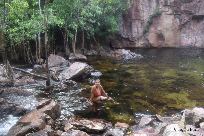 I 135 esglaons cap a baix, arribes a la seva base i allí, t’hi pots capbussar. L’aigua està fresca, que amb la caloreta que fa tot i ser les 9 del matí, s’agraeix d’allò més. A nedar una mica, i en un no res ens plantem a sota la caiguda d’aigua, quin gust sentir-la a sobre, i observar com cau l’aigua des del darrera… Uffff crec que no hi ha una millor manera de començar el dia, això t’omple d’energia positiva!!