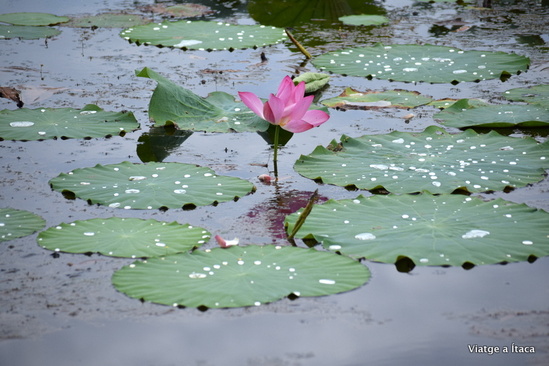 De sobte l’entorn es comença a fer més maco, l’aigua estancada deixa de tenir arbres per començar a ser una zona més oberta plena de flors de lotus i les seves fulles.