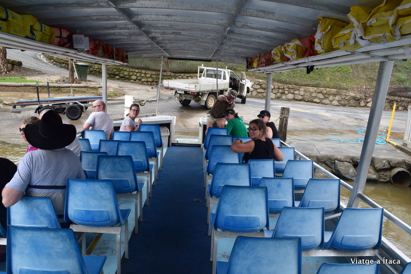 A canvi, des de la població hi ha tres o quatre ofertes de creuers pel riu, en els quals pots veure cocodrils i multitud d’ocells segons indiquen a la seva propaganda. A Daintree Village, no hi ha massa cosa. Un parell de restaurants, càmping, i hotel, però a més tenim el Cocodrile Express. Una empresa que té dues embarcacions que recorren dues parts diferents del riu, i on per 25$ dòlars pots fer tants trajectes com vulguis durant diversos dies. Ens han convençut, comprem un passi, i anem a fer un dels últims passejos del dia.