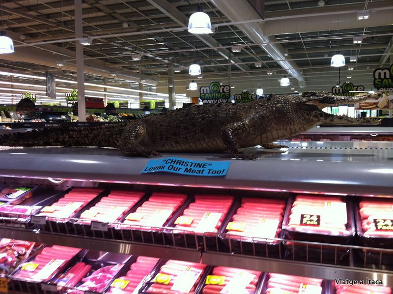 Ja són les quatre, i l’últim trajecte a l’altre part del riu és ple, així que per avui no farem res més. De camí a zona de dormir, un supermercat on comprar alguna cosa per sopar, que avui sembla que tampoc podrem cuinar. De carn no en comprem, tot i que el cocodril que hi tenen, ens digui que a ell li agrada molt….