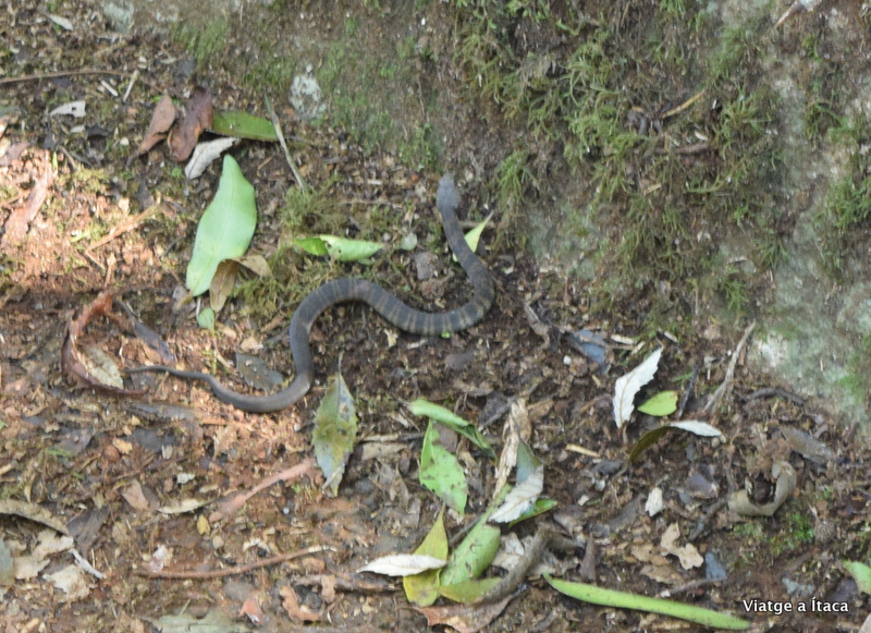 I tot just abans d’arribar al cotxe, una petita serp al nostre pas. Aquí s’ha d’anar molt amb compte amb elles, perquè no es deixen veure massa, tot i la quantitat que n’hi ha, però val més tenir cura que aquesta no sabem si porta verí o no.