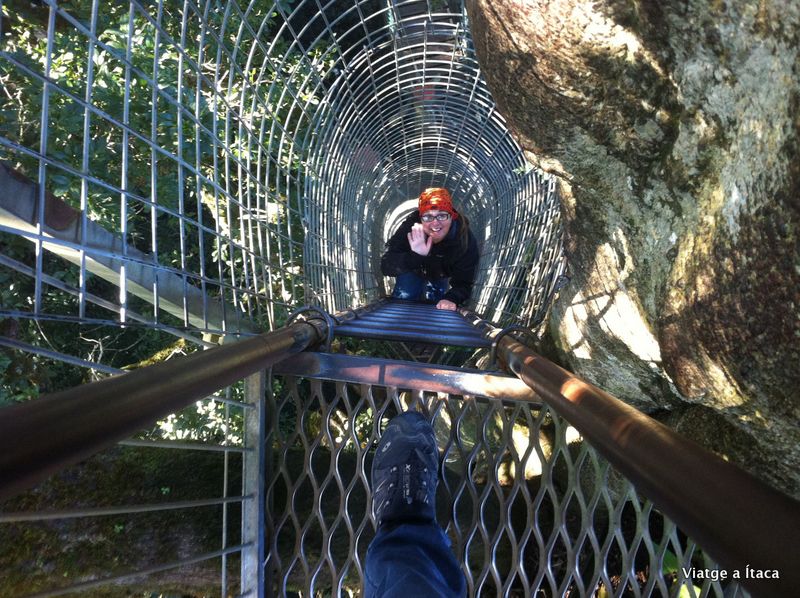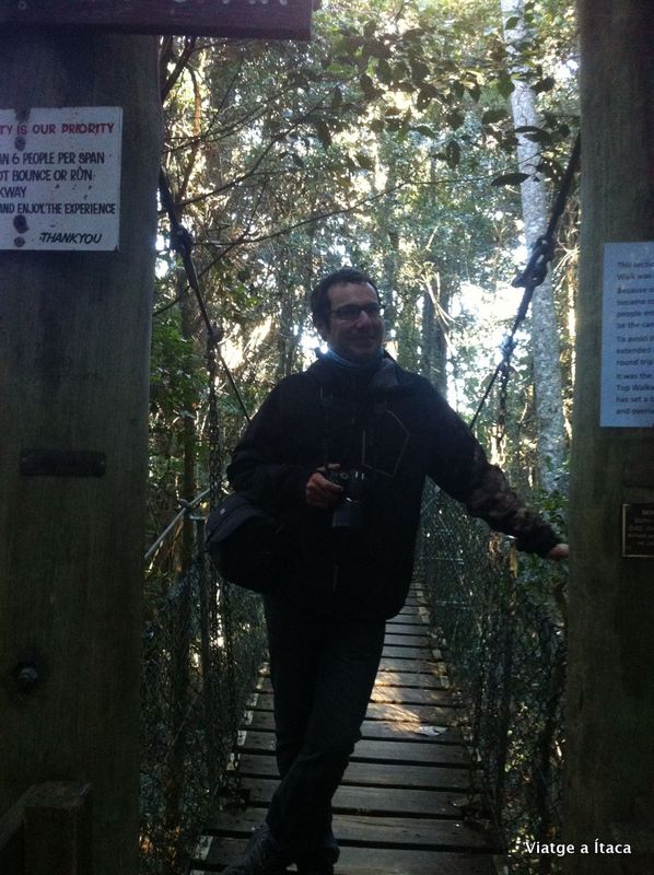 Hi ha moltes passejades assenyalades per aquí de duració diversa, però nosaltres anem caminant una estoneta, fins que trobem un desviament que ens porta cap a una passarel·la entre arbres, i des d’on pots pujar més amunt fins a alçades d’entre vint i trenta metres.