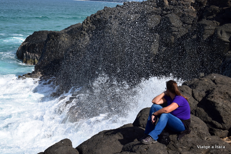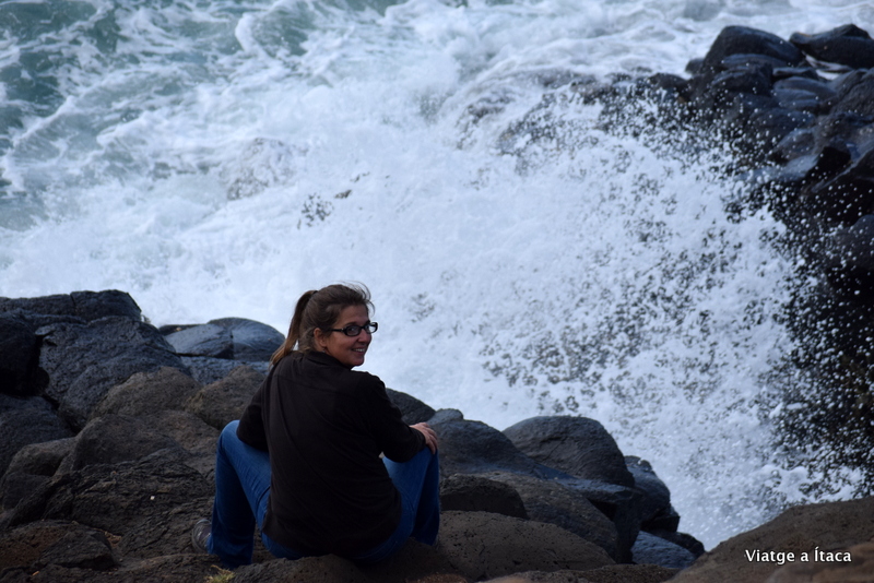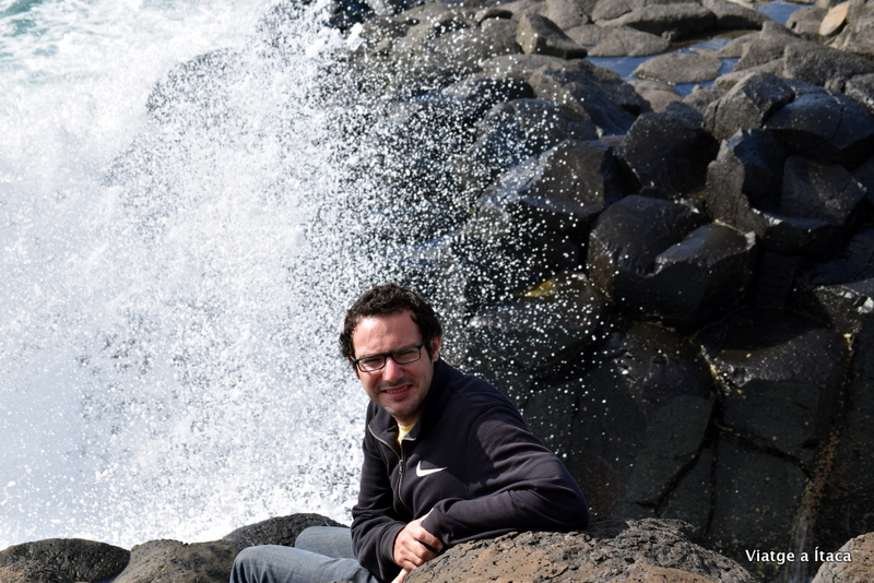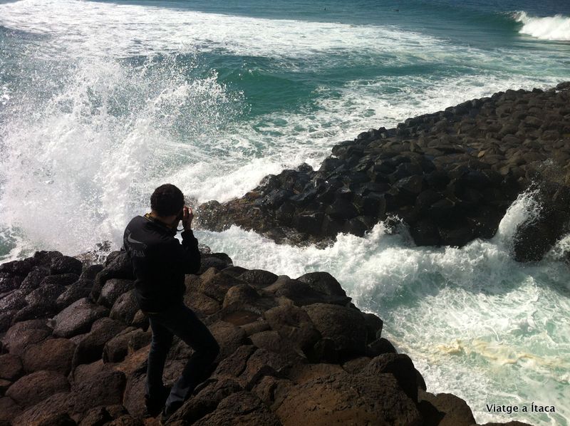 Negre, blau, i blanc de les onades quan trenquen contra aquesta barrera natural que permet en forma d’escala natural apropar-se a l’aigua, vigilant que una onada massa embravida no se t’emporti mar endins.
