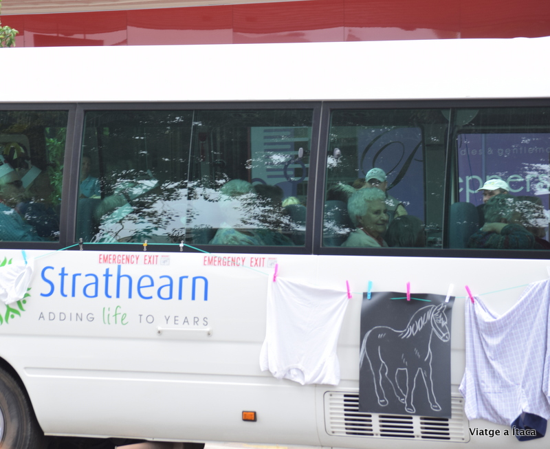 I darrere, van apareixent un seguit de comparses diverses, que mentre passen iniciem un joc en que l’Eva i jo les intentem relacionar d’una manera o altre amb el món del cavall. Algunes més evidents, i altres menys com la de dansa (pobres quin fred devien passar), les de laser tag i les seves pistoles, o l’autobús ple d’avis que han sortir d’excursió del geriàtric de la zona.