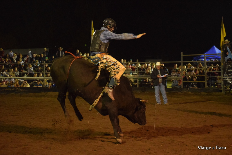 Ara toca un per cowboys, i aquest ens deixa una mica al·lucinats. Una bèstia amb una bona cornamenta corre d’una porta a l’altre, i en aquestes que el genet ha de saltar del seu cavall, agafar les cornes abans de posar els peus a terra, i al caure amb la força del seu cos, tombar a l’animal en el menor temps possible. De bojos…