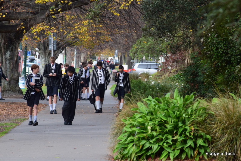 Anglicisme en petits detalls, en una ciutat que es va fundar en els seus inicis per construir una ciutat utòpica, on pogués prosperar la moral victoriana de la classe mitjana anglicana. La idea, de la Canterbury Association, formada per membres del Christ Chruch College de la universitat d’Oxford, i d’aquí el nom de la ciutat. Per sort, no queda massa d’aquella idea, però l’escola només per a nois i aquests uniformes ens criden l’atenció.