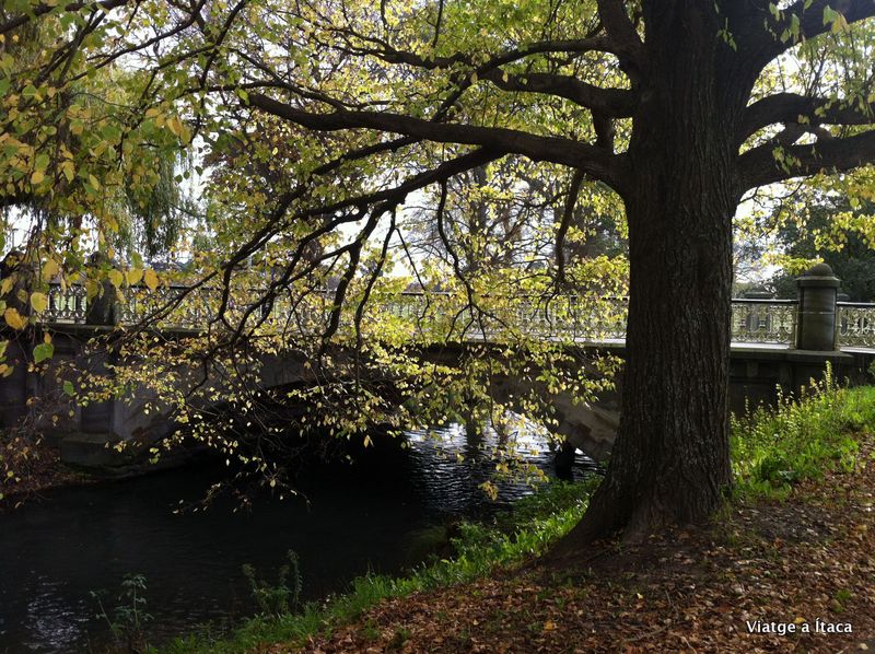 Arbres amb fulla caiguda a la vora del riu, i entre passejants a peu, un espai per les barques, que un barquer amb aires de gondoler, convida a gaudir sota preu massa alt per a nosaltres.