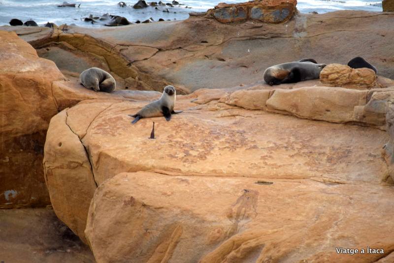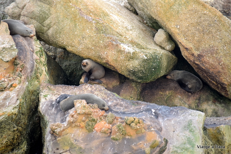 Ara, de foques si que n’hem vist, acomodades a les roques tot prenent el sol, o la pluja. Avui n’hi havia algunes, tot i que no moltes, o és que potser a Kaikoura n’hi havia moltíssimes i clar al comparar…. Doncs aquí ens han semblat poquetes, però igual de mones que les que ja havíem vist.