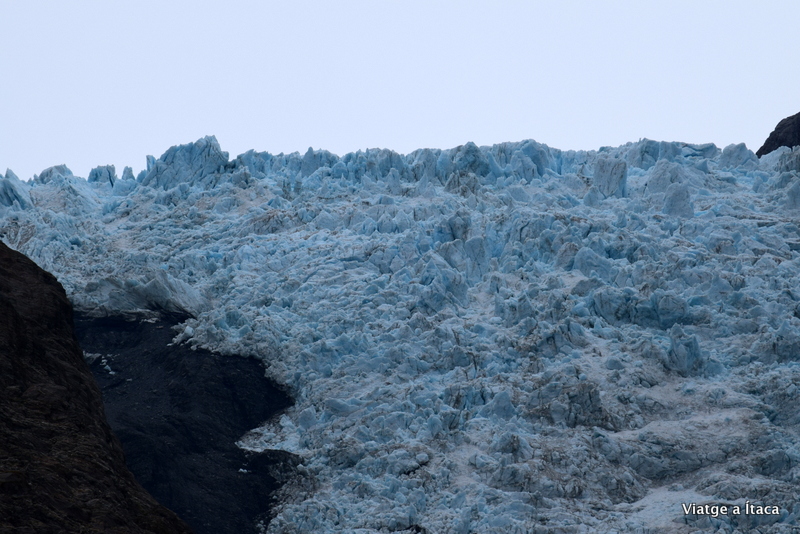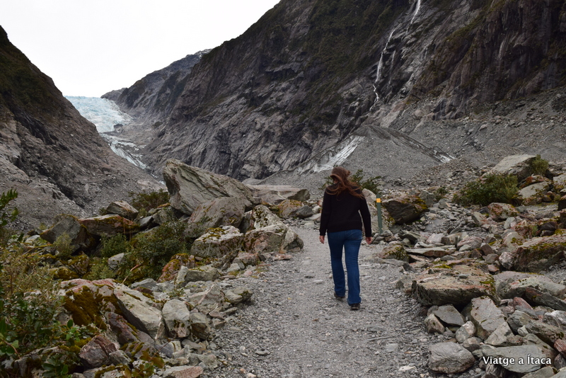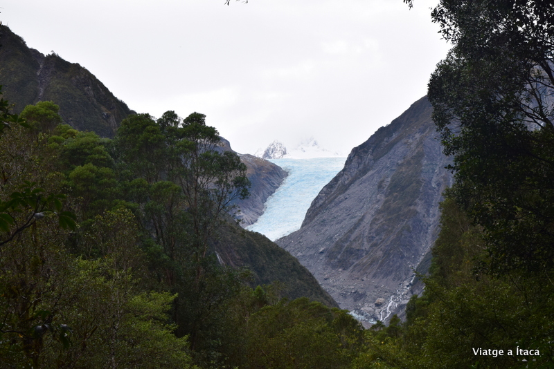 Una visita ràpida a la botiga, i desfem carretera per anar cap al primer dels glaciars, el Fox. Només a 24 quilòmetres del mar, i envoltat d’una bellesa espaterrant segons diuen, pots gaudir d’aquestes llengua de gel que només es troba a 300 metres per sobre del nivell del mar. La primera aturada, és a on indica que hi ha un petit mirador, des d’on observar-lo des de la llunyania.