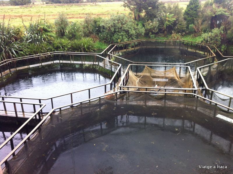 L’activitat principal és donar de menjar als residents de les piscines, i tot i que no para de ploure, algun petit grup segueix amb el pla que tenien previst tornant a entrar ben xops. Esperàvem trobar salmó bé de preu, i preparat per fer sashimi com al nostre enyorat llac Pukaki, però ni la varietat de preparats, ni els preus ens convencen a comprar-ne.