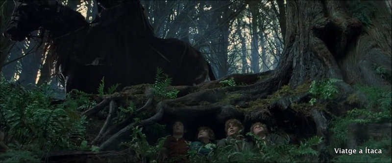 “Los otros dos corrieron hacia la izquierda, metiéndose en un hoyo, no lejos del camino, y agazapándose. Frodo dudó un segundo; la curiosidad, o algún otro sentimiento, luchaba con el deseo de esconderse. El ruido de cascos se acercaba. Justo a tiempo se arrojó a un lugar de pastos altos, detrás de un árbol que sombreaba el camino. Luego alzó la cabeza y espió con precaución por encima de una de las grandes raíces.
