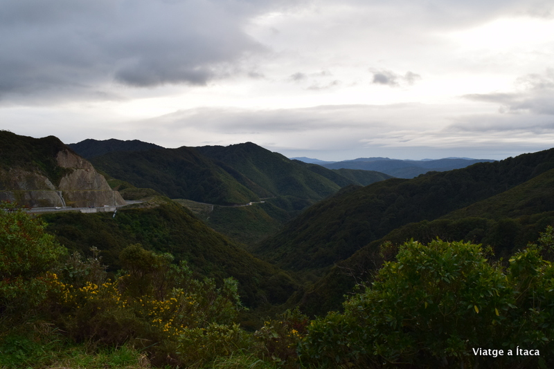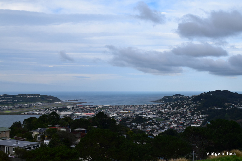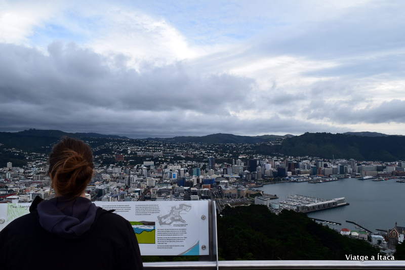 Aparquem el cotxe en un petit pàrquing a tocar del mirador. La vista és senzillament esplèndida. Al costat un cartell on explica els forts vents que hi ha a la ciutat i et recomana anar amb compte quan bufi fort. I és que degut a la seva situació geogràfica la ciutat soporta forts vents contínuament, fins al punt d’anomenar-la Windy Wellington.