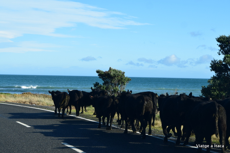 Amb tota la informació al sarró, ens encaminem cap a la costa. Hi ha un parell de coses que volem visitar i es a una mica menys de cent quilometres d’on ens trobem. Per aquí, poc a poc quan t’allunyes de la carretera central que recorre l’illa, la circulació es fa intermitent, no tants cotxes que circulin entre els verds dels prats, que les vaques i les ovelles fan seus. Mar de fons, i invasió de bòvids a la carretera que t’envolten quan els intentes avançar, mentre ells són conduits al seu tancat.