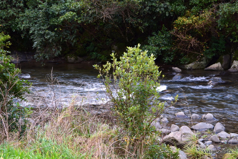 I feta la visita toca avançar carretera cap al nostre destí dels propers dies, la zona termal de Rotorua. Per fer-ho, seguim carretera cap a Opotiki, i quan la foscor comença a intuir-se ens endinsem a la Waioeka Gorge, una bonica i humida gorja on fem aturada per dormir aquesta nit a la zona d’acampada de Manganuku. És un càmping del DOC que funciona amb una d’aquelles bústies on has de deixar els 6 dòlars per persona. Estem sols, tot i trobar-nos al costat d’un riu interessant per a la pesca.