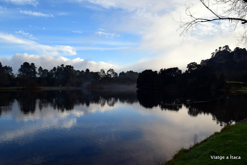 Ens llevem aviat. Gris el cel però no plou. El llac d’aigües tranquil·les al costat, i tres furgonetes aparcades que encara dormen. Un cafè, cereals i suc de taronja acompanyen la xerrada matinera, després de recollir el llit i muntar la taula on esmorzar. Tenim reservat un tour per a Hobbiton a les onze, però com no tenim massa cosa a fer abans, i no sabem exactament on és, anirem fent via cap allà.