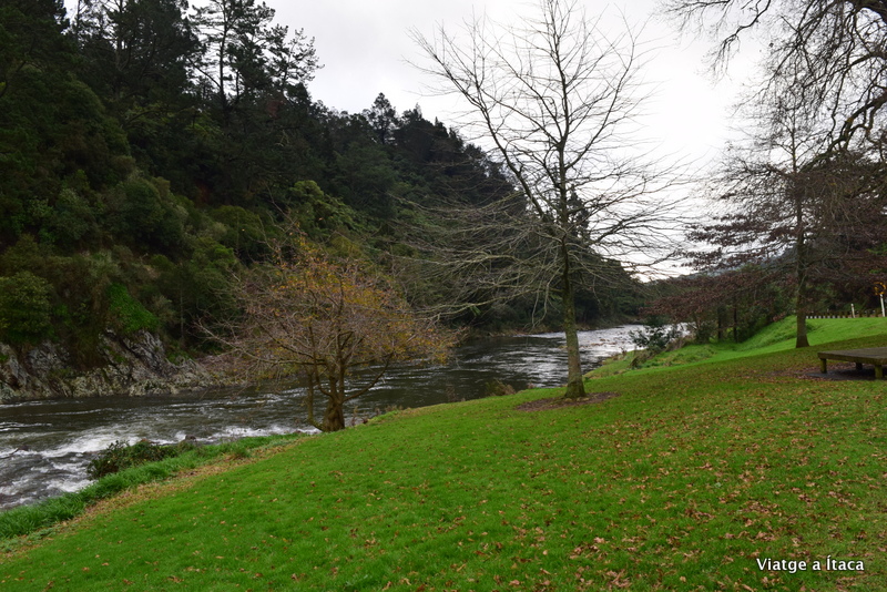Una estoneta de biblioteca, fem una tros de carretera, i ens acomiadem de la comarca. Anem apropant-nos poc a poc cap a Auckland, però ens queden uns dies i ho farem primer passant per la costa. Hem de creuar les muntanyes, i hem escollit un pas que segons sembla és força bonic. Es tracta de Karagahake Gorge, on a l’entrada veiem que hi ha una zona habilitada amb lavabos, al costat del riu per poder-hi fer nit. De fet, es tracta d’un aparcament molt gran, però on només en set o vuit dels aparcaments, estan senyalitzats com que es permet estacionar-hi durant la nit.