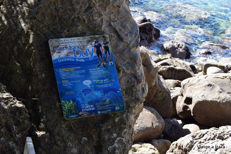 Quatre escales i baixem a Gemstone Bay, una petita cala de pedres arrodonides. Tota aquesta zona forma part d’una reserva marina protegida, i hi ha una cosa molt curiosa que ens ha sobtat, i que caldrà provar en la propera ocasió. Es tracta del snorkel trail, una mena de itinerari senyalitzat on poder-te submergir a allò que tant agrada, de posar-te ulleres aquàtiques i perseguir peixos de colors.
