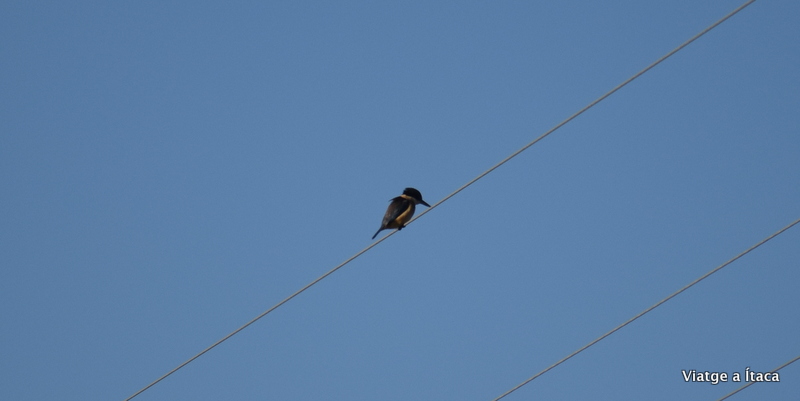 Deshidratats arribem a la zona d’aparcament, amb dues idees molt clares. Una, agafar l’ampolla d’aigua molt freda que tenim preparada a la nevera, i segona, que tot i que per aquí ja és hivern, avui és dia de pantalons curts i xancles. Última nit, i la farem com els campions. Dotze quilometres al sud-est de Whitianga, i a tocar d’on ens trobem, hi ha el nostre destí, la platja de Hot Water Beach, on farem nit a un càmping de la cadena Top 10, la nostre preferida per aquestes terres. El preu és el de sempre. La diferència? Que aquí lo que es porta és llogar pales… Per què? Us preguntareu. Un petit kingfisher blau sobre un cable elèctric no és la resposta, però ens encanta aquest ocell… ☺