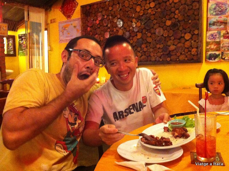 Caminem tot el passeig, i finalment ens decidim per un restaurant dels molts que hi ha. Nosaltres no triem massa menjar, no tenim molta gana, i ells tampoc. Ho fem tot per compartir, i quan acabem, la Thuy creu que hem demanat poc i ens quedarem amb gana, així que demana un parell més de plats per nosaltres tot i que diem que ja estem be. Quan els porten, el My amb el millor posat de mare, ens omple els plats i ens obliga a menjar… ☺ Nosaltres els tenim en una alta estima, però ells sembla que ens hagin adoptat…