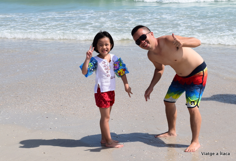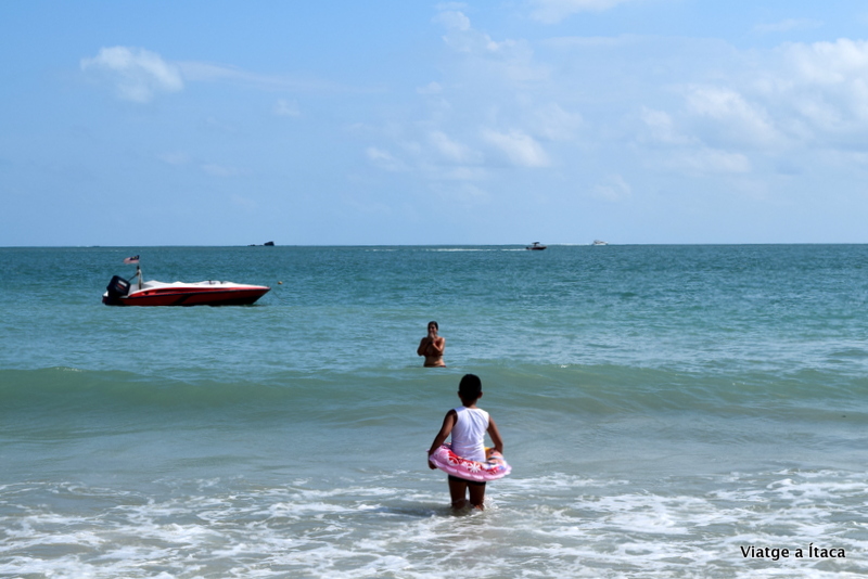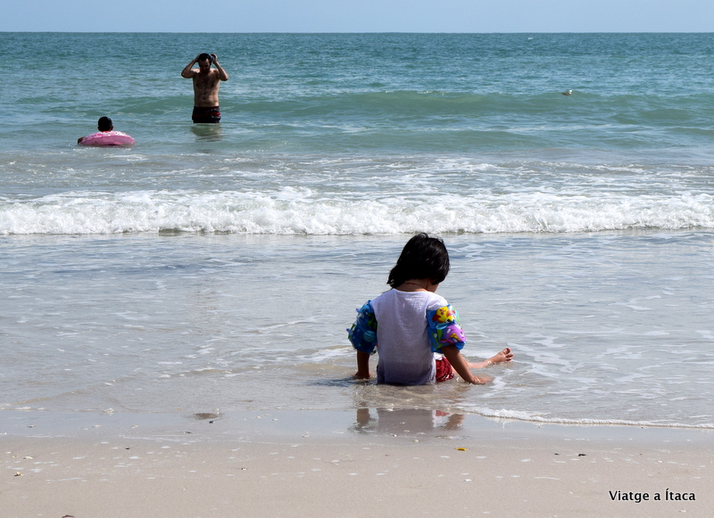 Una mica més descansats, i ja preparats, sentim veus. Els nostres noms ressonen en veus de dos petits, que venen engalanats amb els seus banyadors, i disposats a anar a la platja. Unes abraçades, i mentre ens expliquen emocionats la seva aventura al parc de Legoland, recorrem els deu minuts que tenim fins a la vora del mar. La marea està alta, hi ha molta oferta turística, excessiva pel nostre gust, i l’aigua remoguda. No massa neta, però trobem un punt on deixar les coses que amb la calor que fa necessitem remullar-nos ja.