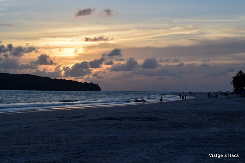 Uns capvespres deliciosos, i és que des d’aquest costa de l’illa pots veure com el sol s’amaga a l’horitzó, sobre el mar. En algun blog llegit, comenten que és de les millor postes de sol que es poden veure. No sabem si tant, tenim massa bons records de Goa, però realment val la pena passejar per la sorra una estona, i seure davant del mar, en una petita cantonada que fa la platja, entre ressorts de luxe, i veure com el color del cel va canviant.