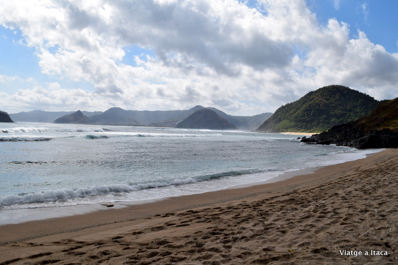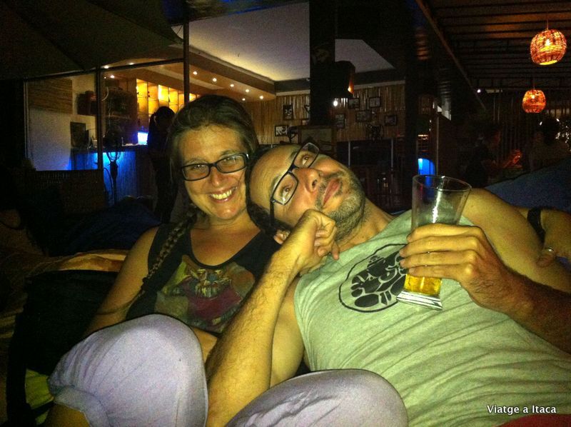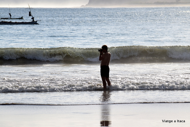 Nosaltres ja assecats i llestos per seguir endavant, cap a la següent platja. Aquesta és idíl·lica tot i que ara no toca el sol sobre la fantàstica badia. Surfistes que aprofiten les fortes onades serveixen per entretenir-te, mentre prens una cervesa sota les quatres fustes i les fulles de palma, que fan de xiringuito d’aquells de passar-hi la vida.