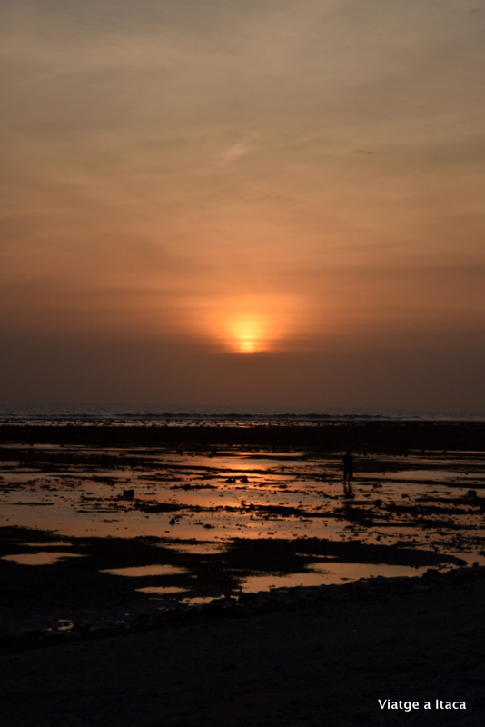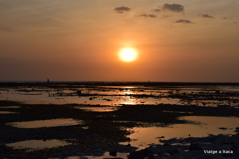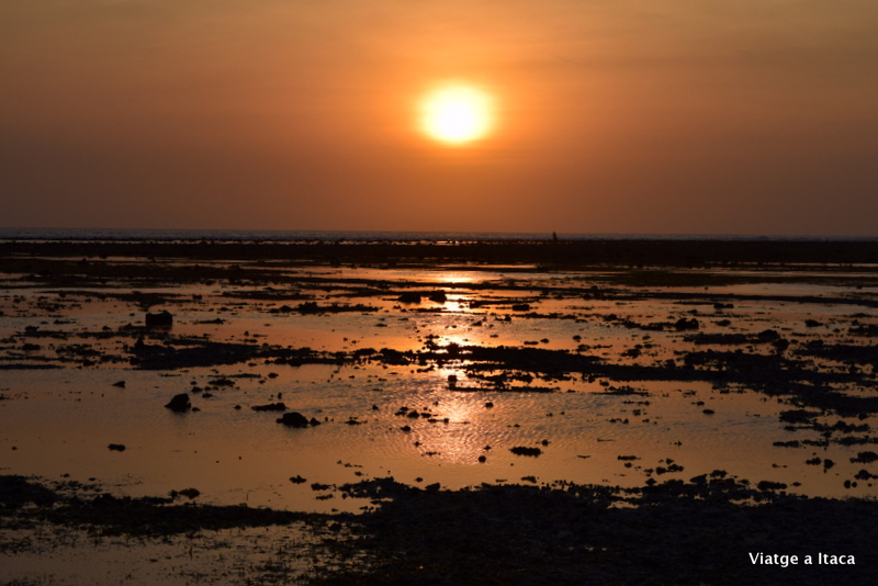 Decidim no fer platja, i necessitem una dutxa, pel que ens resguardem de la calor a l’habitació durant una estona. Sortim a passejar quan estem temperats, ja vestits amb roba de “mudar”, i mentre l’Oscar es fa un massatge a quatre mans que el deixa entre baldat i extasiat. Quan el trobem, està molt vermell, ell diu que de massatge, nosaltres creiem que avui sent l’últim dia li ha tocat més sol del compte… ☺ Fem camí cap al Sunset point. El joc de marees està en el seu punt més baix des que vam arribar a l’illa, desplaçant la línia de mar molt més enllà de la nostre posició, mentre el sol poc a poc es va ataronjat.