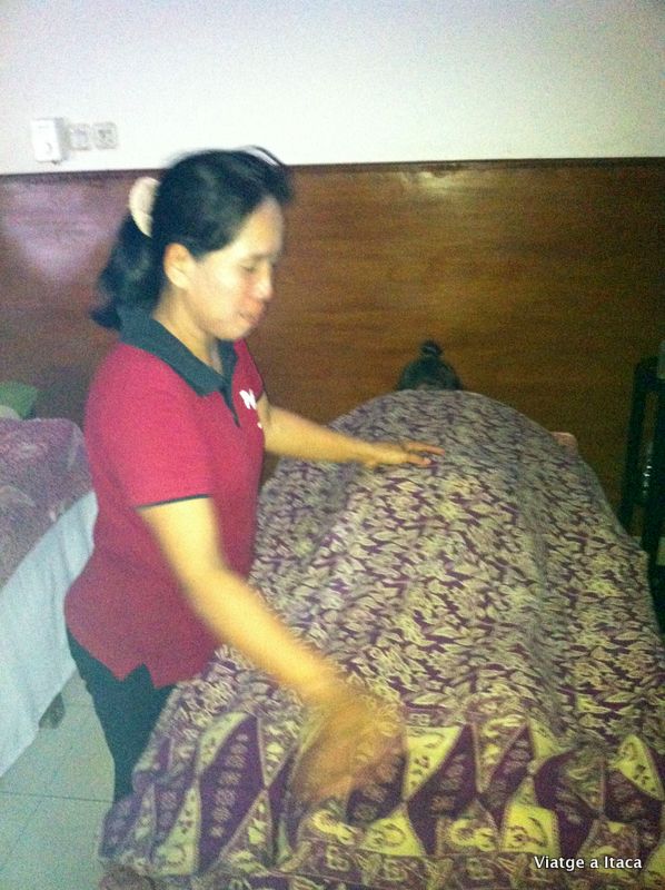 Així que amb la nit feta, i el matí a la piscina, toca tarda de cuidar-se. Opcions infinites i variades en preu, però en els massatges hi ha una de les millors en seguretat d’èxit. Després de voltar i recopilar informació decidim repetir a Sehati . No té les instal·lacions d’altres del tipus spa, ni tractament complicats de bellesa. Però per 60.000 rúpies, et pots fer una hora de massatge d’esquena. O per 70.000 rúpies, un massatge tradicional balinès de la mateixa durada. Al canvi, i sumats no arriben tots dos als 10 euros. És la segona vegada que venim. Repetim, així que podeu imaginar que no ens ha agradat gens ni mica… 😛