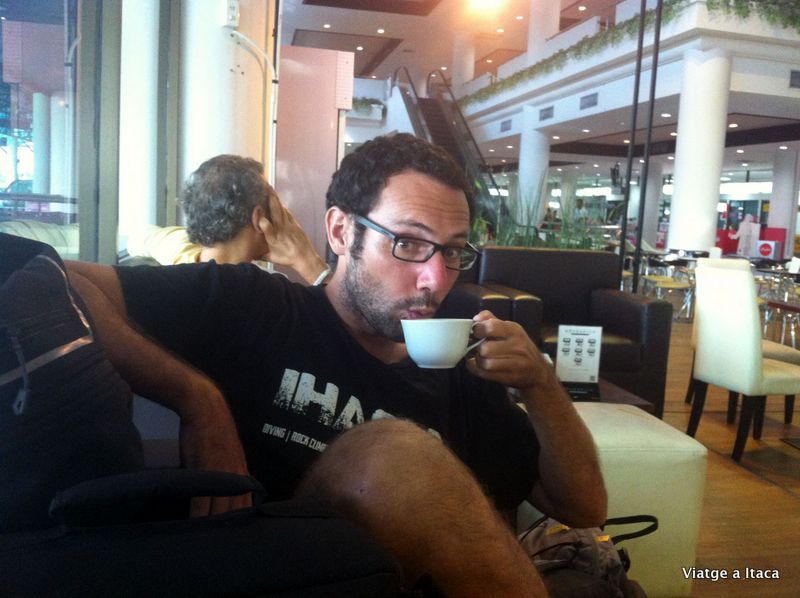 No arriba a quaranta minuts el trajecte. Al volant, el conductor fitipaldi. Ens acomiadem dels catalans de Manresa. Els nostres camins es separen aquí. Ells marxen en un tres i nores, nosaltres hem d’esperar encara una bona estona. Aprofitem un dels locals, on tenen unes butaques molt còmodes, on gastant els pocs baths que ens queden, podem passar les cinc hores connectats a la wifi, bevent tres cafès força decents. Només tres a repartir, no hi ha baths per res més…