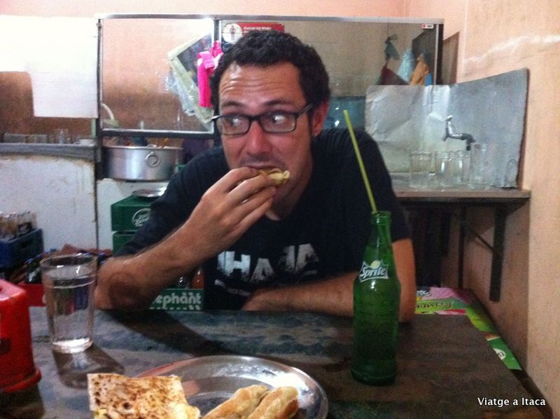 En un, de tres taules i mitja, ens asseiem, i un home gran ens demana que volem. Li diem amb senyes que el que ell vulgui, una mica per tastar de tot, i ens respon que perfecte. Torna amb un plat amb una mena de pastissos de carn. Son tres, de diferents tipus, piquen bastant, però estan força bons. El lloc és ple de mosquits, i ens estan posant les cames com un colador, així que acabem i toquem el dos pagant el compte, que aquest si que és molt econòmic.