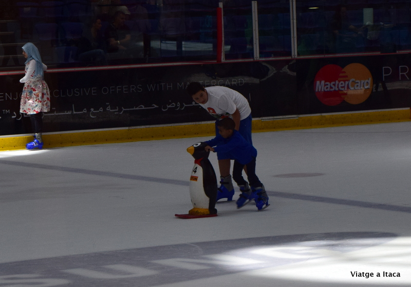 Seguim la nostra passejada i ens porta a una pista de patinatge sobre gel (aquí no hi ha la pista d’sky, és en un altre centre comercial on pots esquiar, mentre a fora fa una calor que espanta) on ens crida l’atenció els pingüins ajudadors que fan servir alguns nens que estan aprenent a patinar, així es senten més segurs no???