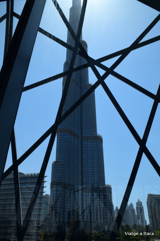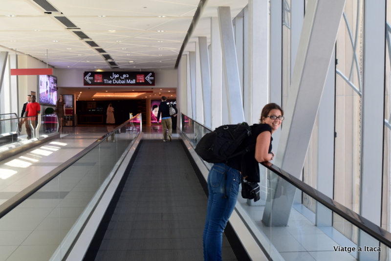 El metro no et deixa ben bé al costat, però per sort hi ha una sèrie de passadissos amb cintes corredores i aire condicionat que t’hi porten, i que a més ja et permeten anar veient el Burj Khalifa el edifici més alt del món, de 848 metres d’alçada.