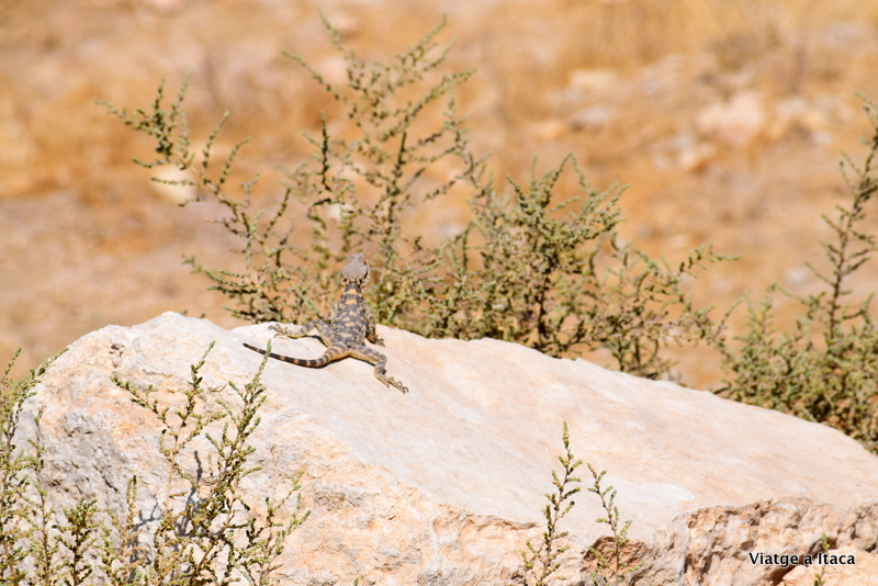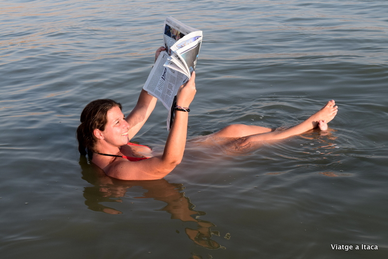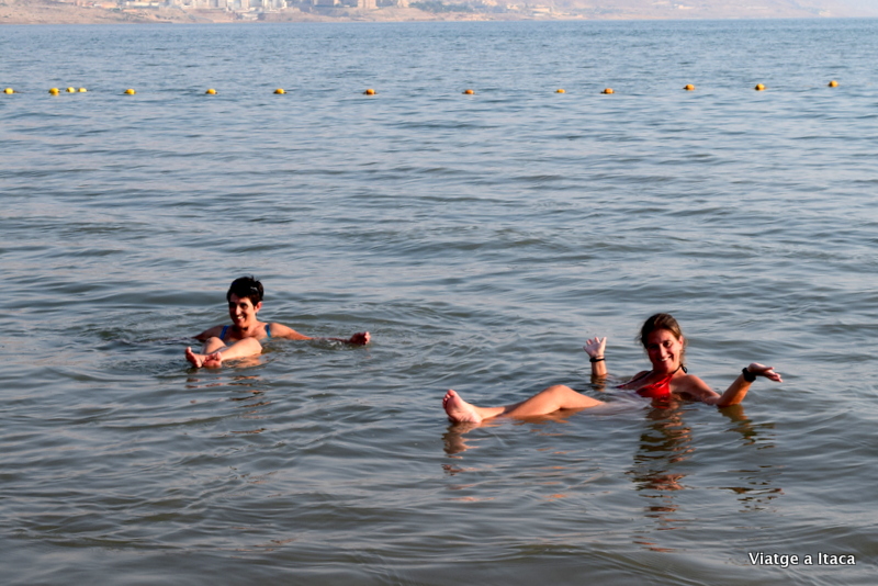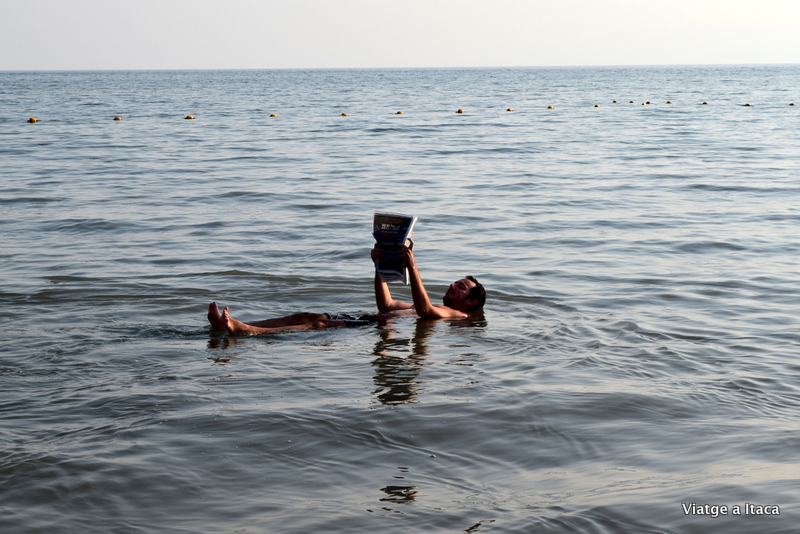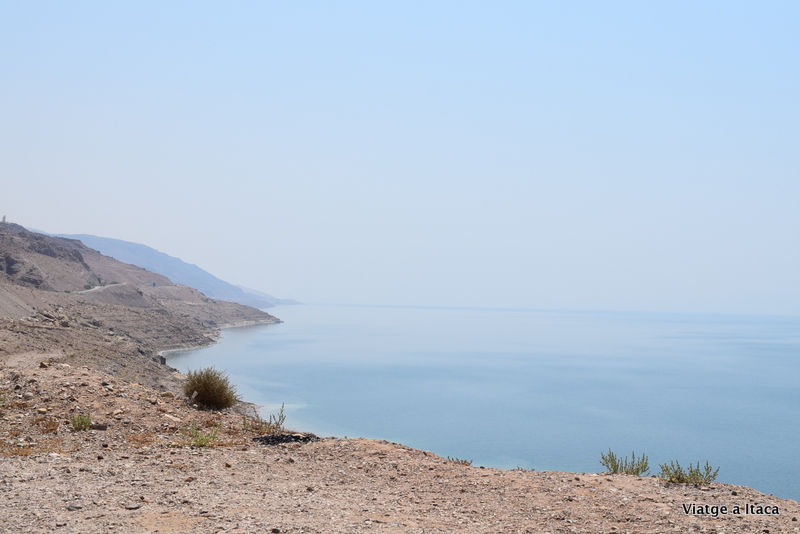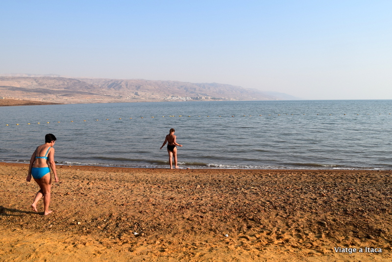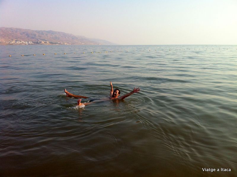 Des dels 817 metres de la muntanyeta, ara toca anar davallant perquè ens dirigim cap al punt més baix de tot el Planeta. A uns 416 metres per sota del nivell del mar es situa el Mar Mort, on la concentració de sal sembla que fa impossible qualsevol tipus de vida. Només vuitanta quilometres de llarg per uns setze d’ample, i cada vegada perdent superfície, perquè sembla que l’evaporació és més gran que no l’aigua que va rebent del riu Jordà. En podem donar fe, perquè a mesura que t’hi apropes, i baixes més i més, entres com en un microclima que et colpeja amb un cop sec de calor asfixiant, que es dissimula només amb una mica de vent.