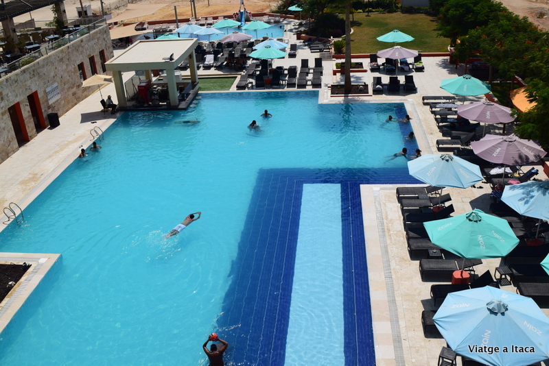 És l’hora de la bellesa, i és que diuen que les sals d’aquest mar són de lo millor per la pell, i tot i que lo nostre és insuperable, intentarem com a mínim mantenir-ho. No estem a tocar de la platja de l’hotel, així que tens un servei de bus que t’hi porta cada trenta minuts més o menys (potser menys que més). No són ni deu minuts de trajecte, però caminant i amb aquesta calor no ho aconsellem. Ja hi som, deixem les tovalloles a les hamaques, i cap a dins…
